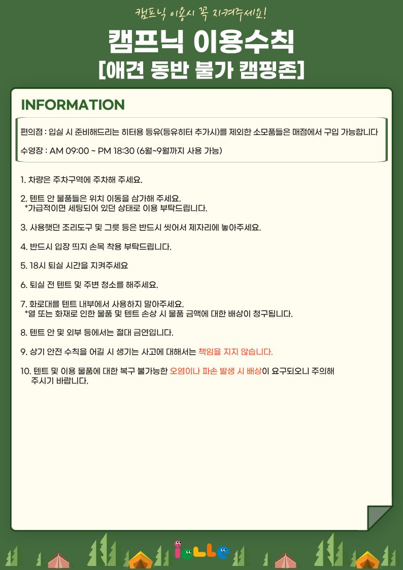 - 물품 및 텐트 파손 시 비용이 청구됩니다